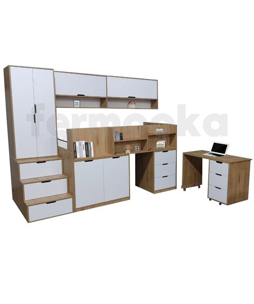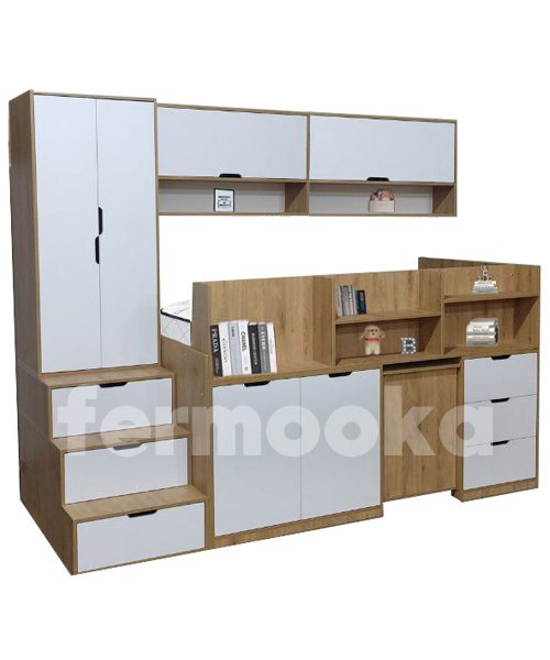 طراحی یکپارچه شامل تخت، میز تحریر، دراور، کمد و کتابخانه