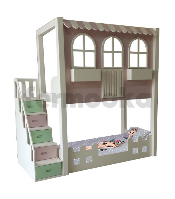 تخت دو طبقه مدل P-11 یکی از خاصترین و فانتزیترین مدلهای تولیدی فرموکاچوب است که با الهام از طراحی کلبه و خانه کودکانه، انتخابی ایدهآل برای اتاق خواب کودک و نوجوان محسوب میشود. این مدل علاوه بر کاربری خواب، به فضای اتاق شخصیت و جذابیت بصری میدهد و باعث ایجاد محیطی شاد و امن برای کودکان میشود.