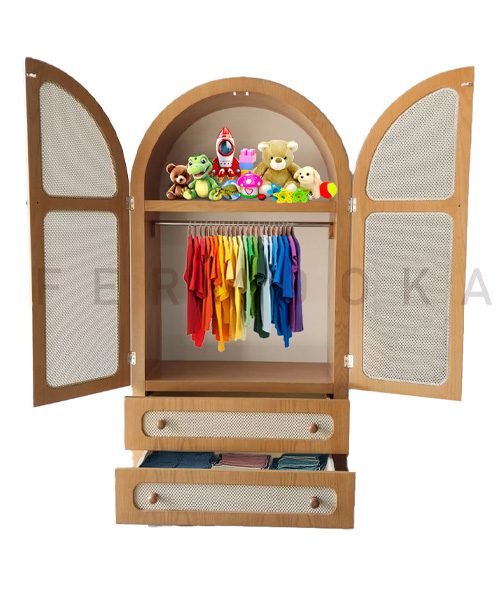 کمد لباس مدل رشدانه، با عرض ۱۰۰ سانتیمتر و عمق ۴۷ سانتیمتر، فضای فراوانی برای لباس، پتو و اکسسوری دارد. وجود دو کشوی دراوری، میله آویز لباس و طبقهی بالایی باعث میشود وسایل همیشه منظم و در دسترس باشند. کتابخانه/ویترین چهارطبقه نیز در سالهای اولیه بهعنوان محلی برای وسایل نوزاد یا اسباببازیها کاربرد دارد و در دوران مدرسه میتواند به کتابخانه رسمی اتاق تبدیل شود. دراور سهکشو با روکش چوبی و نمای توریچوبی، تکمیلکننده این مجموعه برای نگهداری لباس و وسایل شخصی است.